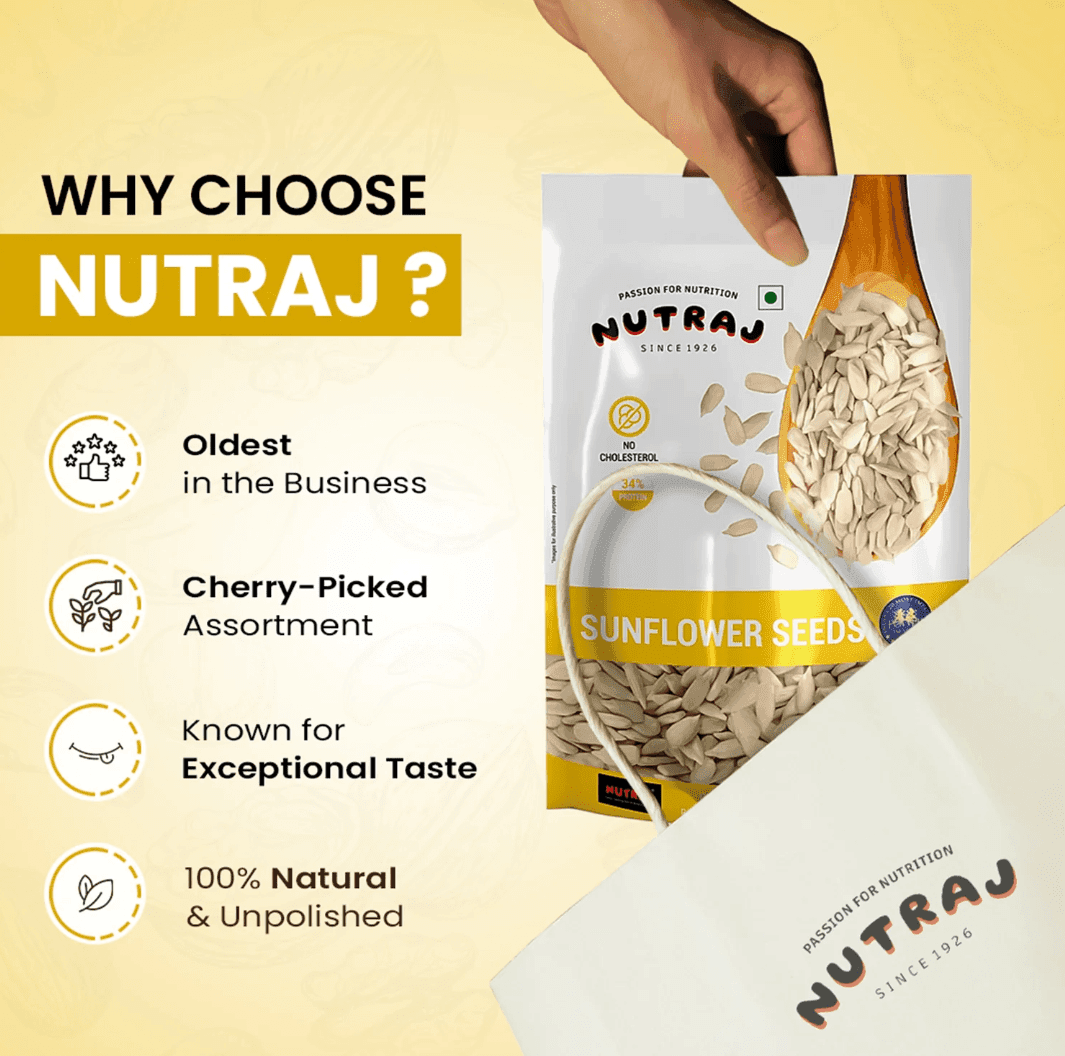 Sunflower seeds are a nutritional marvel that can turn any boring meal into a tasty delight through their mild flavor and crunch. In addition, Nutraj Sunflower Seeds are packed with multiple nutrients which are useful for promoting general well-being. Some of its health benefits include: